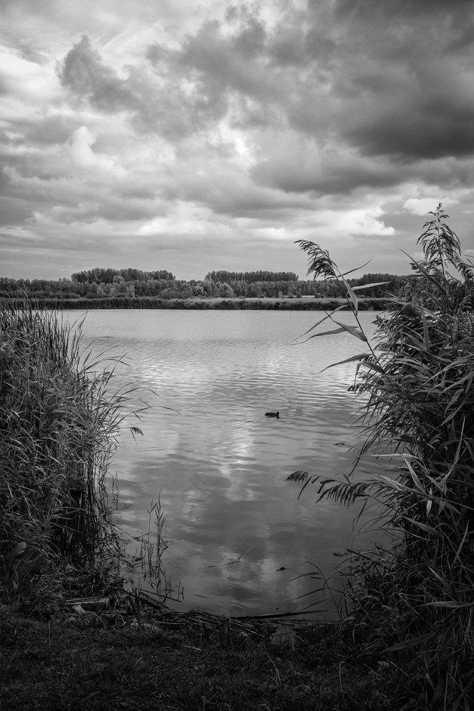 Kijk ik naar links dan zie ik de bomen, het water, vogels die een baantje trekken of overvliegen, vissers. Kijk ik naar rechts dan zie ik de kassen, windturbines, rookpluimen boven industriële complexen.