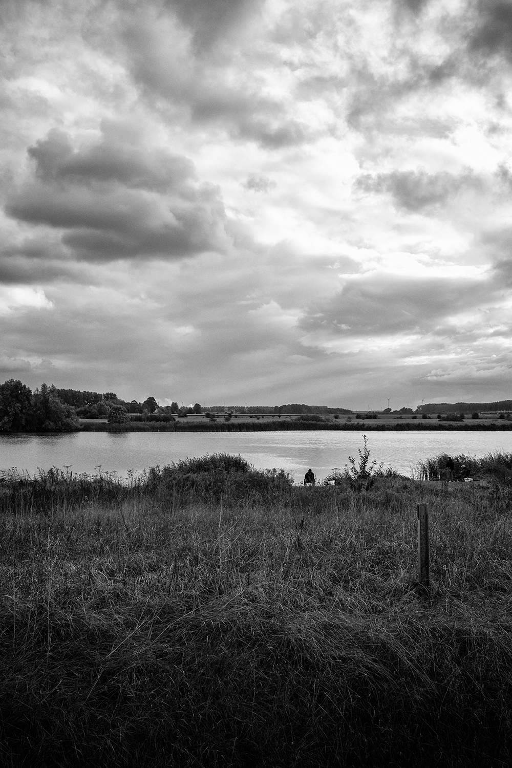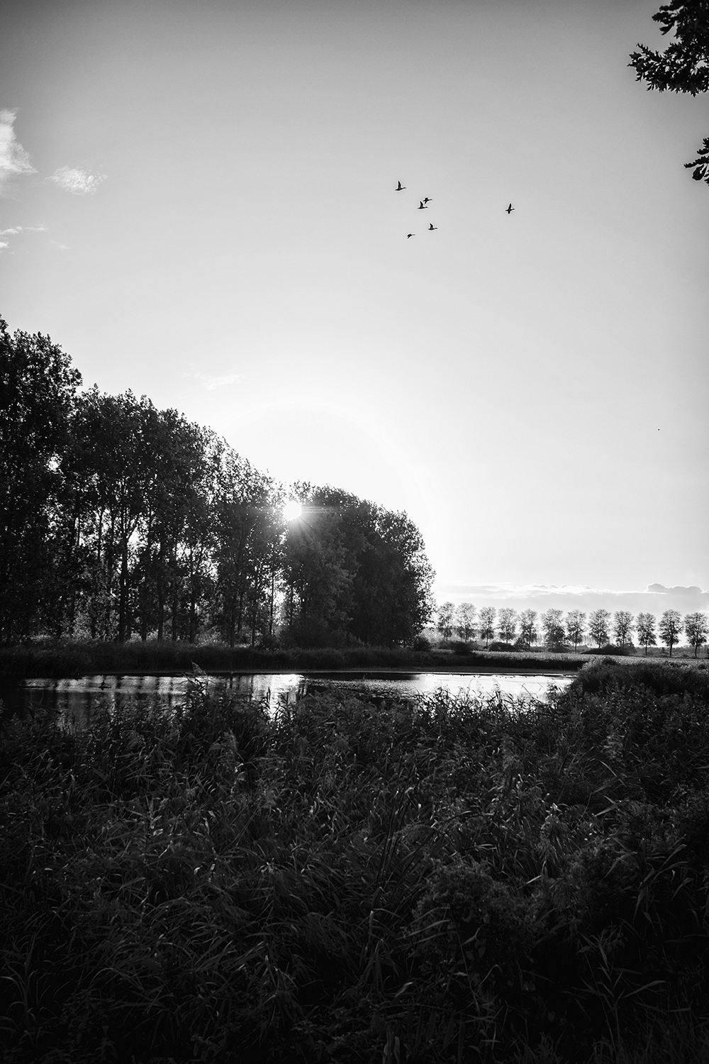 Kijk ik naar links dan zie ik de bomen, het water, vogels die een baantje trekken of overvliegen, vissers. Kijk ik naar rechts dan zie ik de kassen, windturbines, rookpluimen boven industriële complexen.