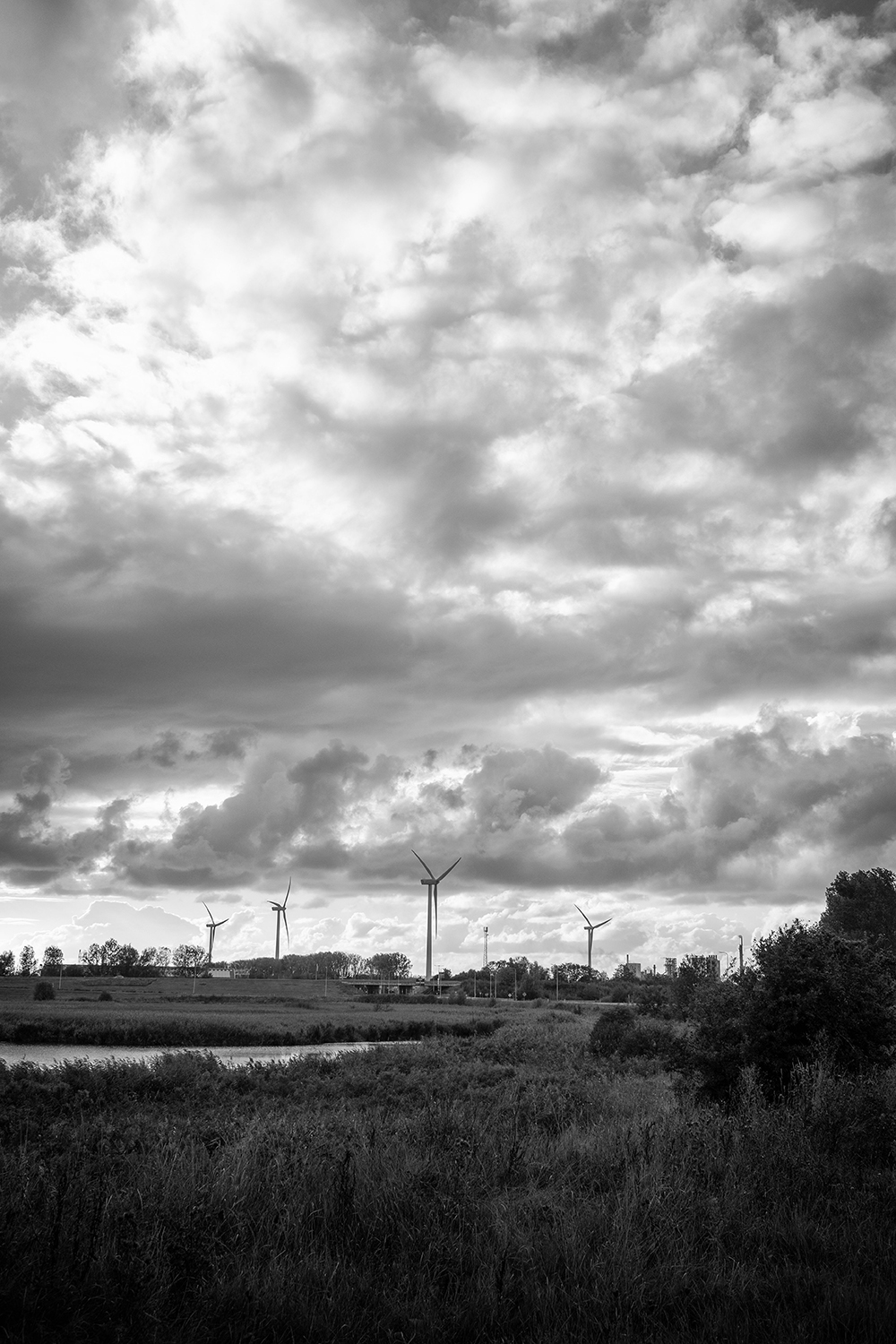When I look to my left, I see the trees, the water, birds swimming their lanes or flying overhead, anglers along the bank. When I look to my right, I see greenhouses, wind turbines, plumes of smoke rising above industrial complexes.